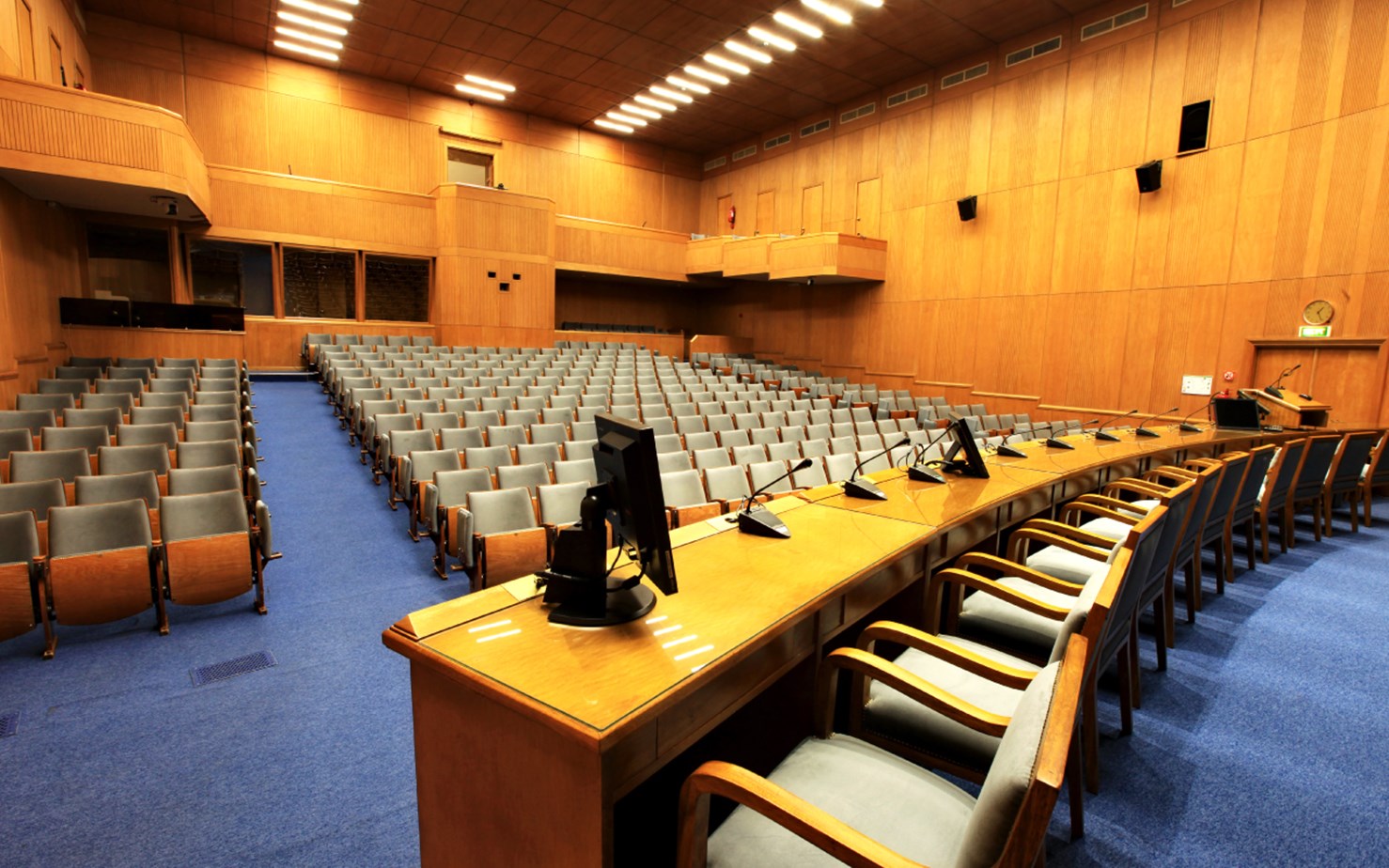 The auditorium extends over two levels: the main seating area located on the first floor and the gallery on the second. The raised permanent stage has a bench with 10 seats for a panel of speakers and a podium. There are also three interpretation booths. If so required, the auditorium may be linked by a two-way image and sound communication system with the adjoining lecture hall, thus increasing the conference capacity to 540 people.